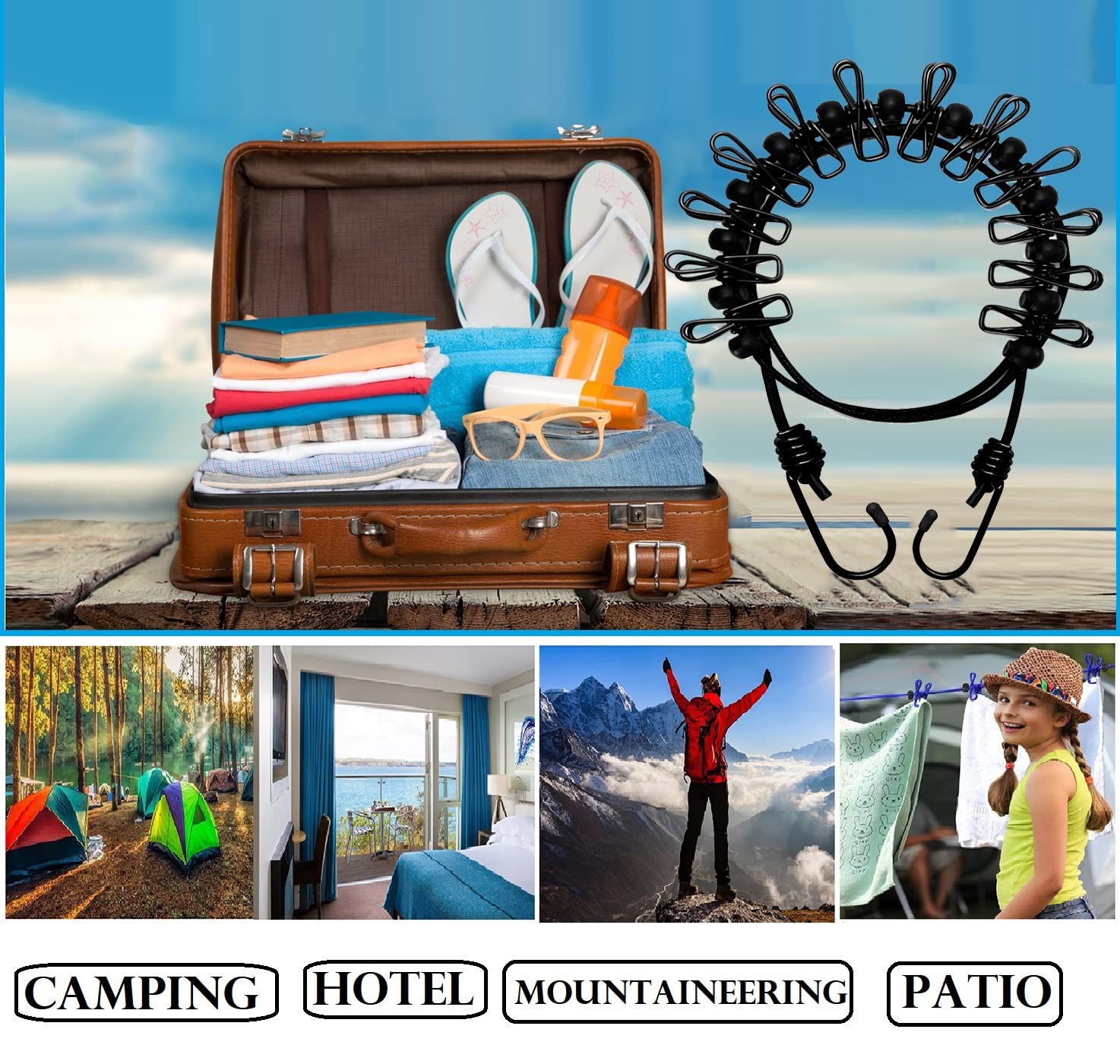 The portable clothesline is easily fixed by two strong hooks, which are made of metal and very strong. Our portable traveling cloth line rope can be attached anywhere